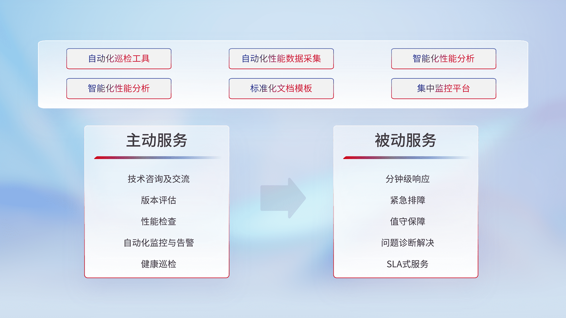 智能化工具和标准化文档,,保障服务质量,,,,提供主动服务(包含技术咨询、、、、版本评估、、性能检查、、、、自动化监控与告警、、、、健康巡检)和被动服务包含(分钟级响应、、紧急排障、、、、值守保障、、、问题诊断解决、、SLA服务)。。